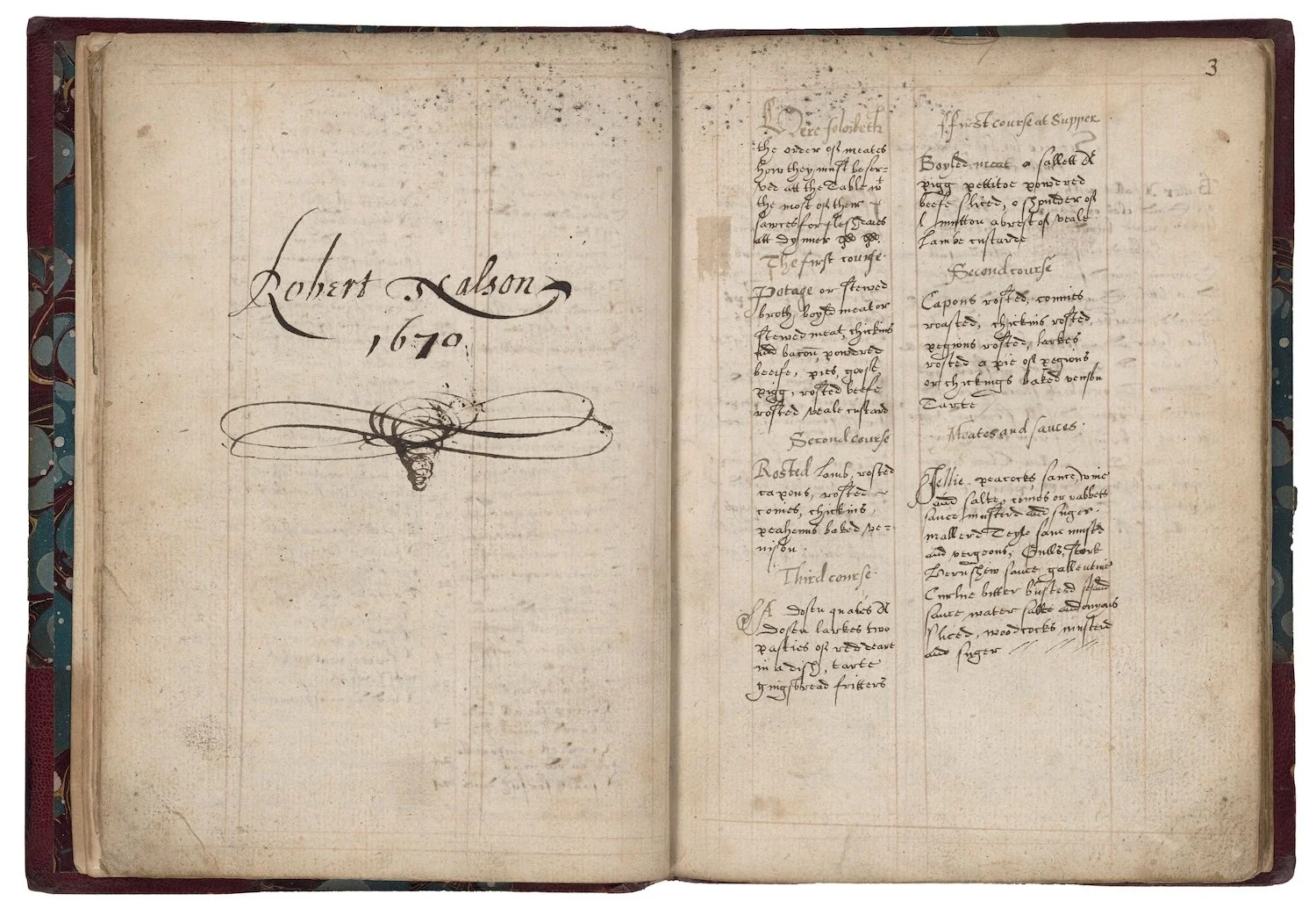 This cookbook from 1650 written by Nicholas Webster instructs readers to serve “rosted peahenns” in the second course of a meal. Folger Shakespeare Library