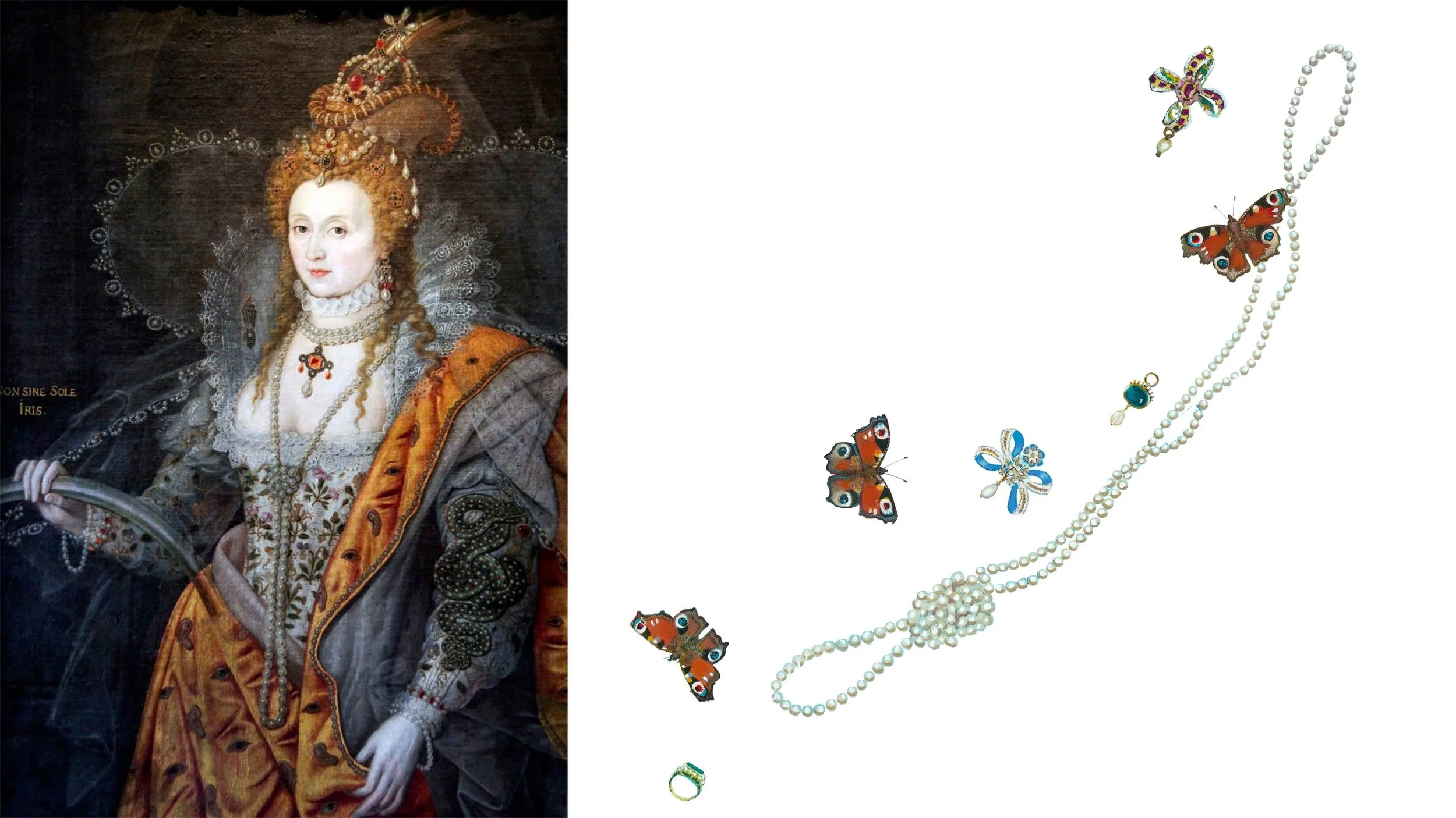In my painting, I chose to render only the male peacock, which is the bird we meet in Shakespeare’s plays. The painting is dotted with three peacock butterflies, one of the most common butterflies in England. To evoke the peacock’s associations with royalty, I surrounded it with examples of seventeenth-century English royal jewelry, including a long string of pearls famously worn by Queen Elizabeth I in The Rainbow Portrait. Elizabeth, known as the Virgin Queen, was especially fond of wearing pearls, as they were symbols of purity and virginity. She reigned during fourteen years of Shakespeare’s career as a playwright.
