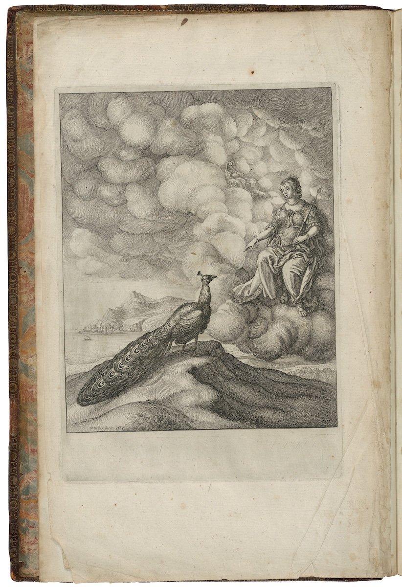 The peacock complains to Juno that it wants a beautiful singing voice, like the nightingale. Illustration by John Ogilby, 1668. Folger Shakespeare Library